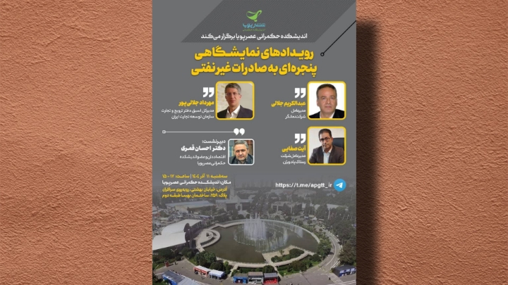 نشست تخصصی «رویدادهای نمایشگاهی؛ پنجرهای به صادرات غیرنفتی» روز سهشنبه ۱۱ آذرماه ۱۴۰۴ به میزبانی اندیشکده حکمرانی عصرپویا برگزار میشود. این نشست با هدف بررسی نقش نمایشگاههای داخلی و بینالمللی در توسعه صادرات غیرنفتی و افزایش سهم ایران در بازارهای منطقهای و جهانی برنامهریزی شده است.